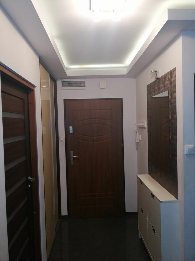 Kuchnia z niezbędnym wyposażeniem: lodówka, piekarnik, kuchenka gazowa, okap. W przedpokoju i sypialni szafy na wymiar. W łazience pralka.