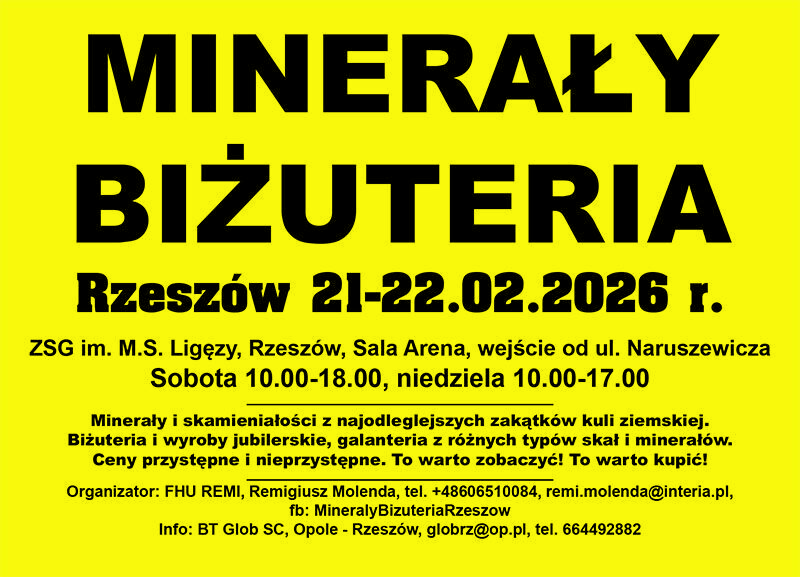 Szanowni Państwo, serdecznie zapraszamy do odwiedzenia ZSG im. M. S. Ligęzy, Sala Arena, wejście od ul. Naruszewicza, Rzeszów(Wystawa przeniesiona z III LO im. Cypriana Kamila Norwida w Rzeszowie przy ulicy Szopena 11. z uwagi na remont szkoły). Będziecie Państwo mogli uczestniczyć w Wystawie i Giełdzie Minerałów i Wyrobów Jubilerskich. Spotkania kolekcjonerów i wystawców to wspaniała okazja do zapoznania się ze skarbami skrzętnie ukrywanymi w głębokich warstwach skorupy ziemskiej. Impreza ta łącząc, walory wystawowo-handlowe może być z jednej strony doskonałą lekcją geologii, geografii, chemii i nauki o środowisku, a z drugiej może stanowić okazję do pozyskania okazów do własnej kolekcji. Umożliwia także nabycie ciekawej galanterii oraz ozdób wykonanych z różnego typu kamieni.