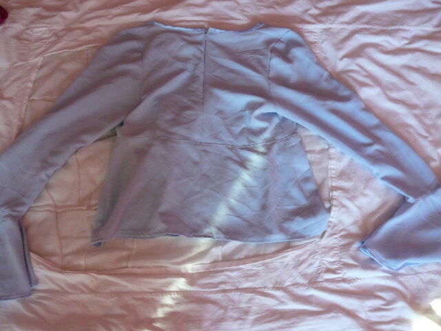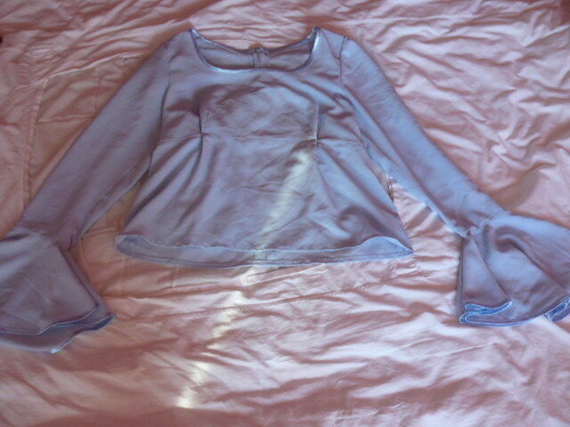 Do sprzedania uzywana bluzka,w kolorze blekitnym,z dlugim rekawem,zakonczonym falbankami,zapinana na zamek z tylu.Szerokosc pod pachami 40 cm,na dole 54 cm,dlugosc 53 cm,dlugosc rekawa 31 cm +falbanka.cvv