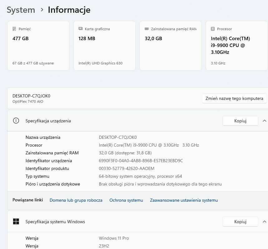 Dell OptiPlex 7470 Intel i9, 32gb ram, dysk 512GB, ekran 24