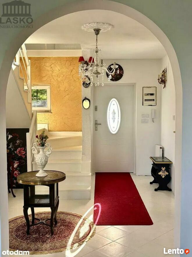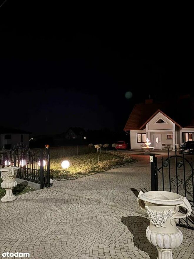 Wrażenie robi tradycyjna, klasyczna elewacja, która nadaje domowi ponadczasowego charakteru. Kostka brukowa ułożona w eleganckie wachlarze (taras i podjazd). Włoska fontanna i ozdobne donice wykonane na zamówienie. Brama wjazdowa sterowana pilotem wygoda i bezpieczeństwo. Wszystkie elementy zewnętrzne (elewacja, kostka, ogrodzenie, nasadzenia) zostały świeżo odświeżone i są w idealnym stanie.