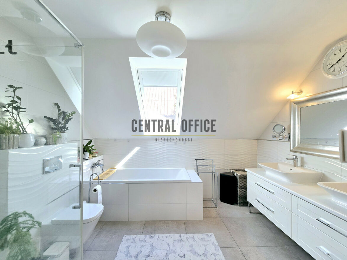 - łazienka na górze: wanna, prysznic, nowoczesny kaloryfer płytowy, hiszpańskie płytki, osprzęt Grohe, Roca, Sanplast, lustro wiszące z dużą, masywną posrebrzaną ramą.