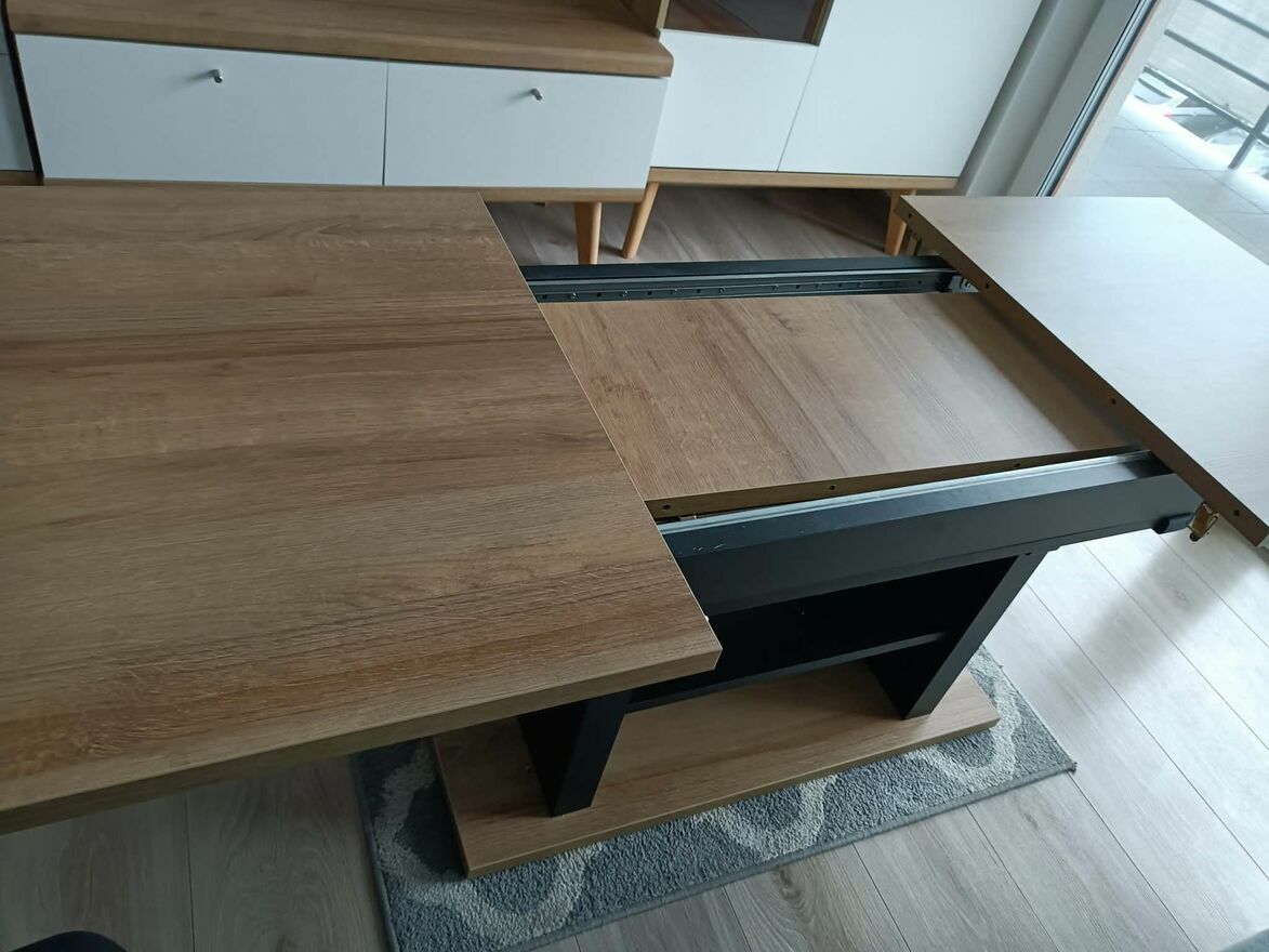 * salonu z którego jest wyjście na duży balkon o powierzchni 10 m2 (kanapa rozkładana ze schowkiem, ława rozkładana na wysokość i wielkość stołu, meble, telewizor, półka)