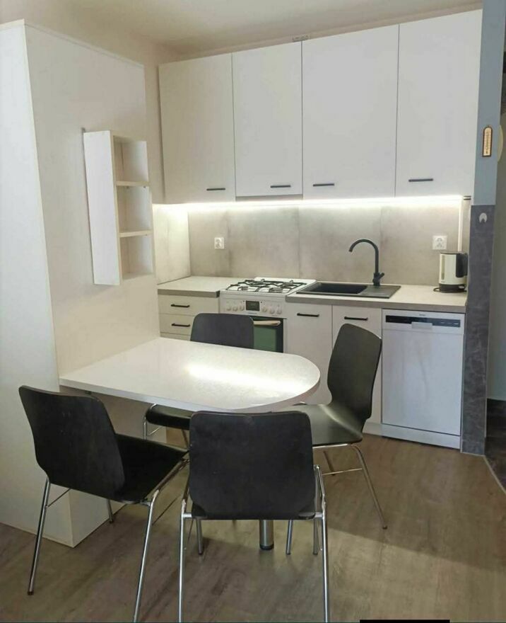 * kuchni połączonej z salonem (zmywarka, lodówko-zamrażarka w zabudowie, kuchenka gazowa, okap, mikrofalówka, czajnik elektryczny, stół z 4 krzesłami)