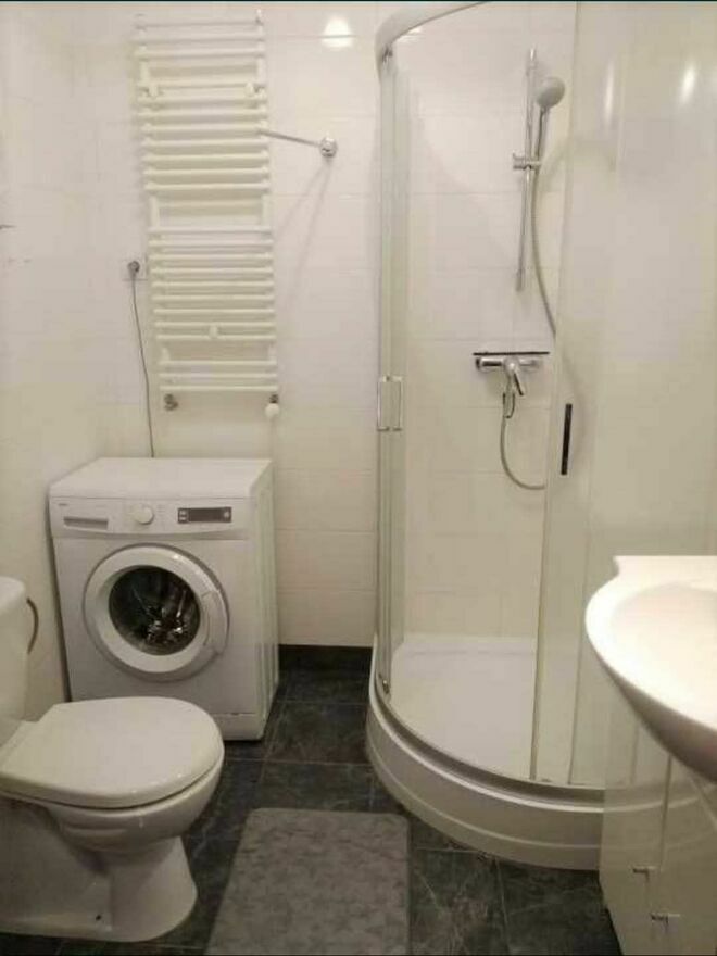 * łazienki (kabina prysznicowa, pralka, umywalka, toaleta, szafka, lustro)