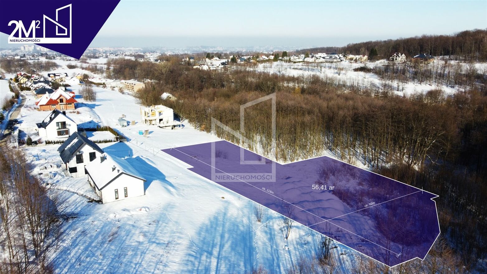 - Powierzchnia: 5641 m² z wydanym wz na dwa budynki mieszkalne.