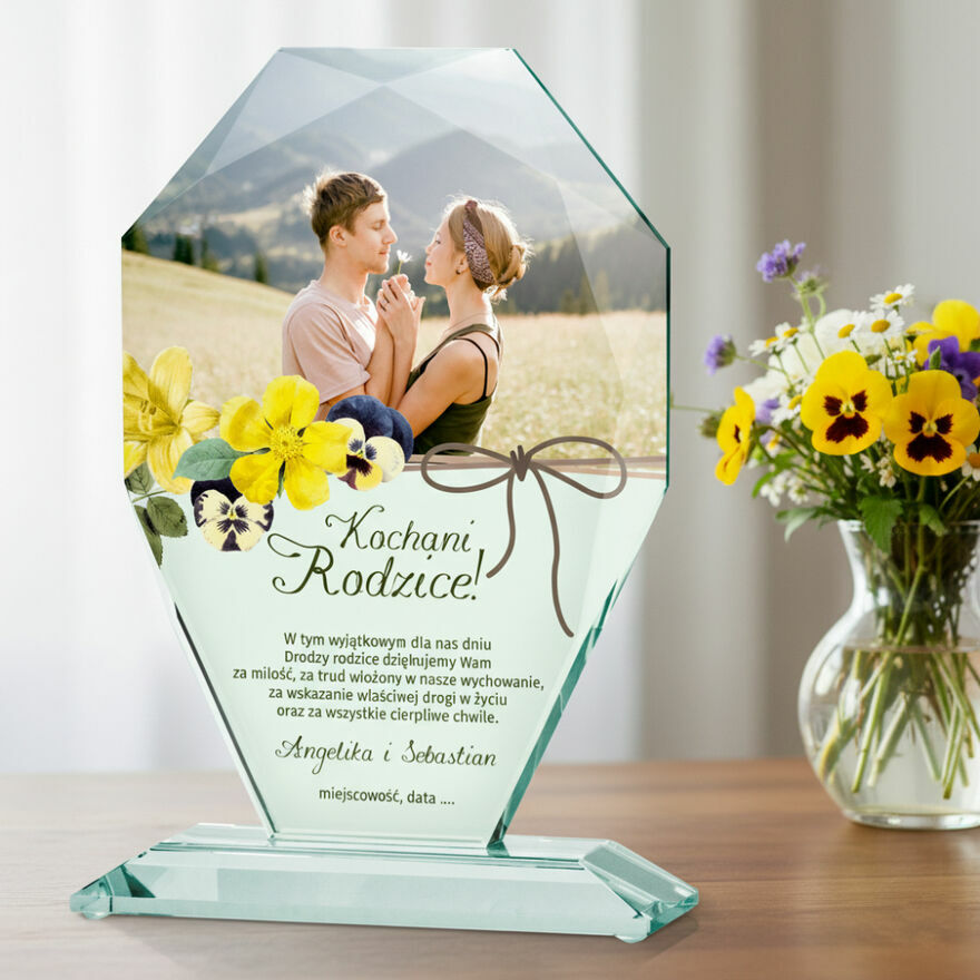 Gotowy produkt będzie wyglądał jak na zdjęciu w galerii – z naniesionym tekstem i przesłanym zdjęciem, przy zachowaniu stałej grafiki oraz szlifów szkła.