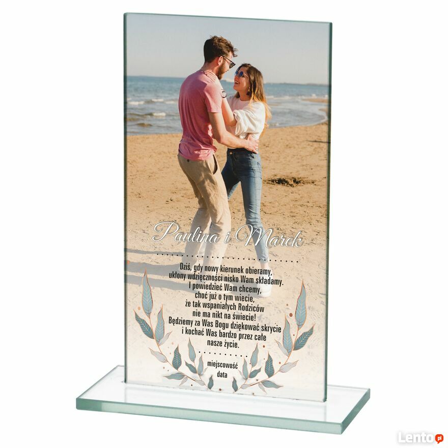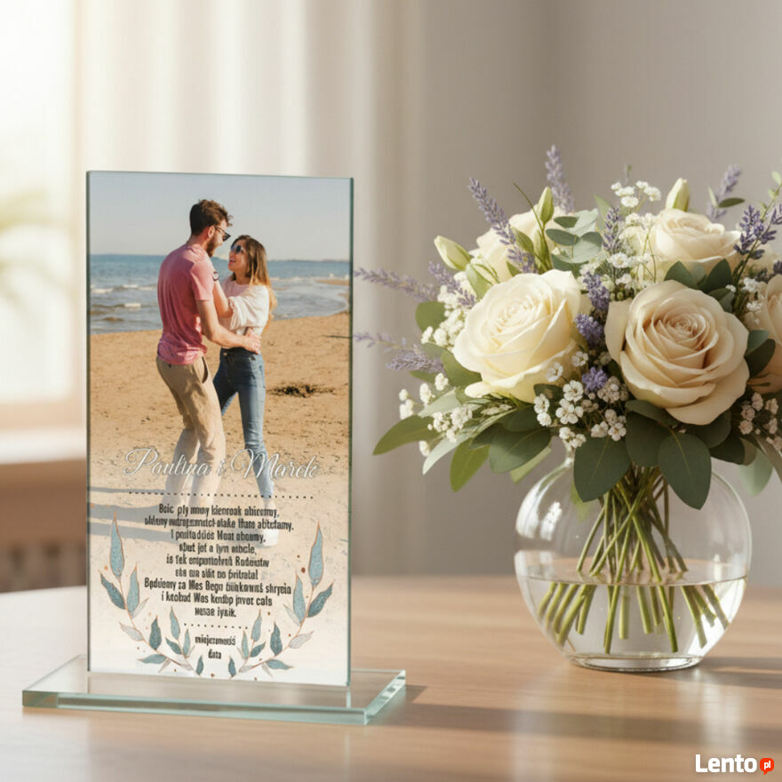 Gotowy produkt będzie wyglądać jak w galerii – z przesłanym tekstem i zdjęciem, przy zachowaniu oryginalnych elementów graficznych. Widoczne szlify na rantach nadają elegancji.