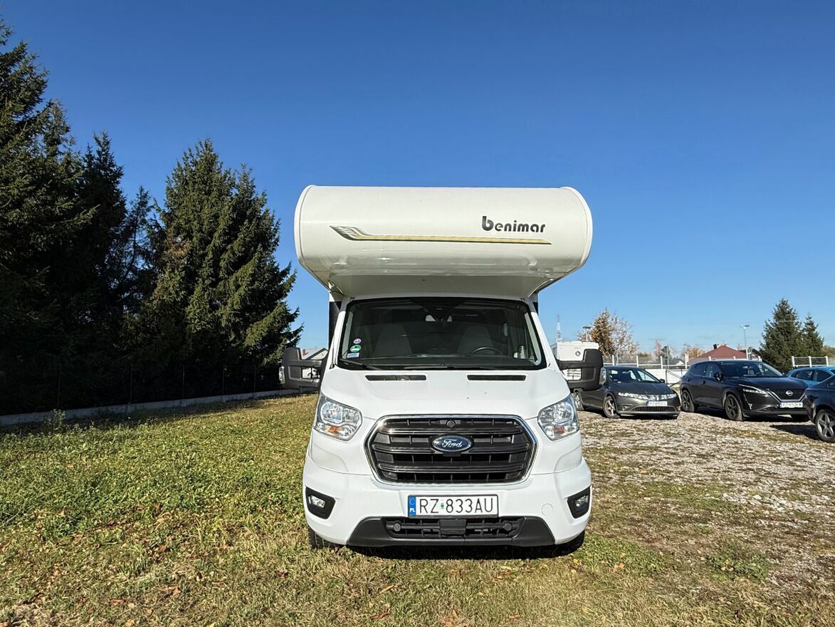 Benimar Sport 363 na Fordzie Transit (automat, 2021, pierwszy właściciel, pełna faktura VAT 23%) – doposażony ponad standard, bezpieczny, stabilny i gotowy do drogi od zaraz.Ten egzemplarz wyróżnia się zabudową bez elementów drewnianych, klimatyzacją postojową z funkcją grzania, panelem solarnym 150 W i pełnym pakietem komfortu (markiza Thule, TV, bagażnik 4 × rower, kamera cofania).