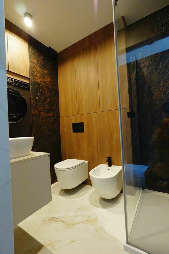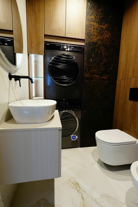 prysznicowa oraz pralka i suszarka, w przedpokoju stała zabudowa, do
