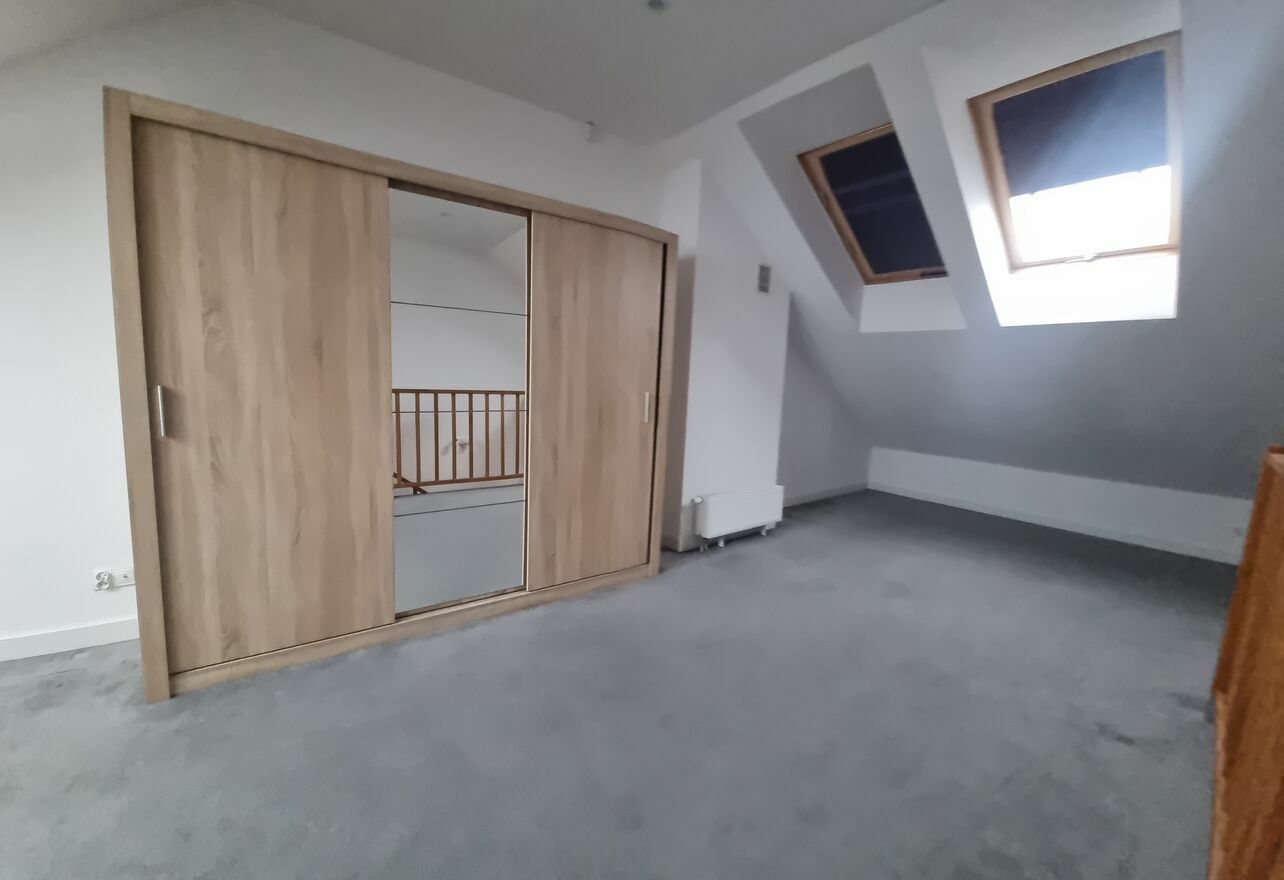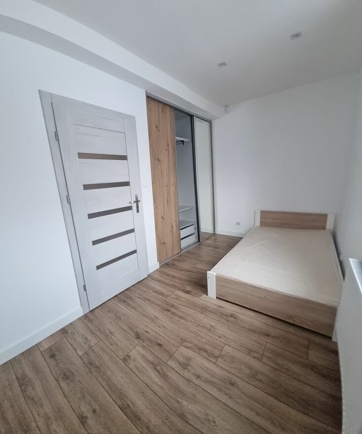 Sypialnie z szafami oraz łóżkiem, przestrzeń na antresoli pokryta przytulna wykładziną.