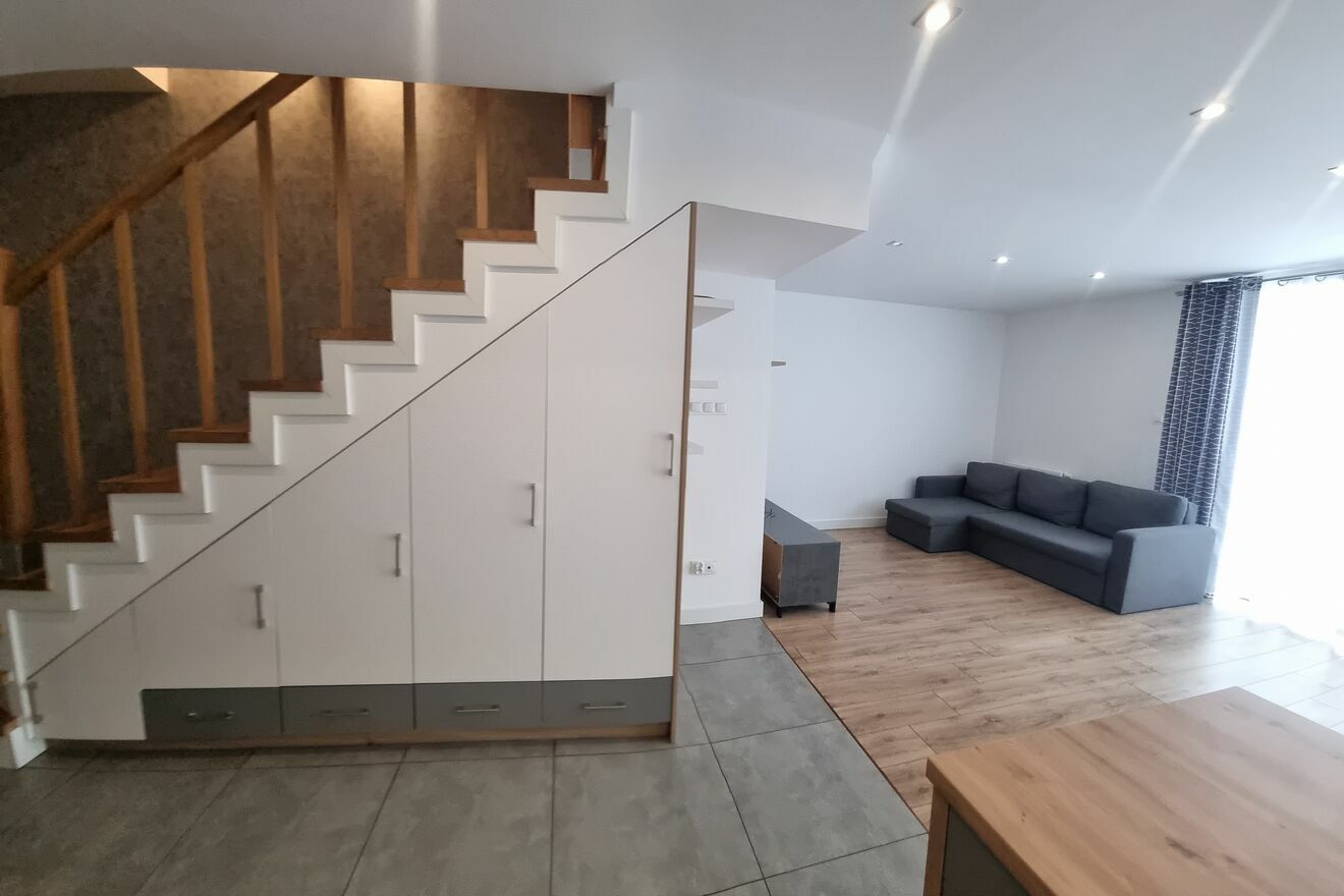 Kuchnia z meblami w zabudowie oraz przestrzenią jadalniana oraz strefą wypoczynkową, znakomicie wykorzystana przestrzeń pod schodami z licznymi półkami i miejscem do przechowywania.