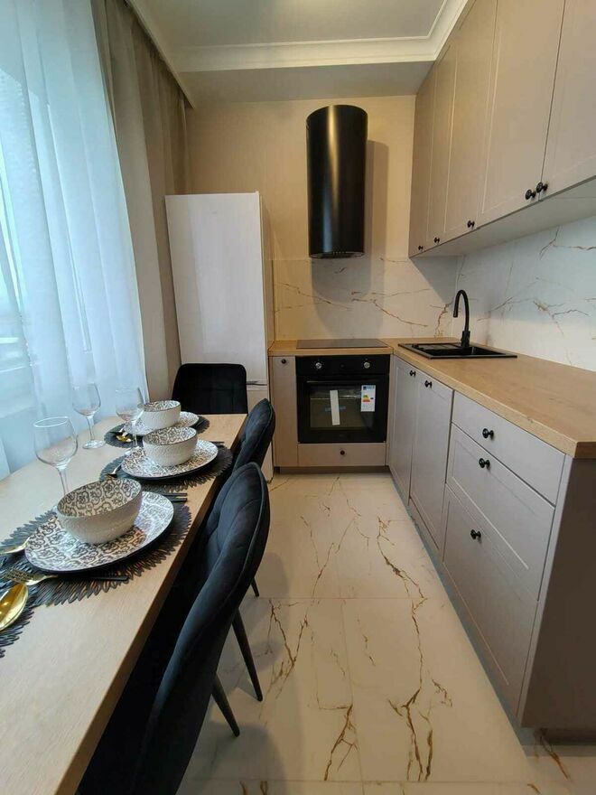 -kuchnia w płytkach z nowoczesną zabudową i sprzętem agd