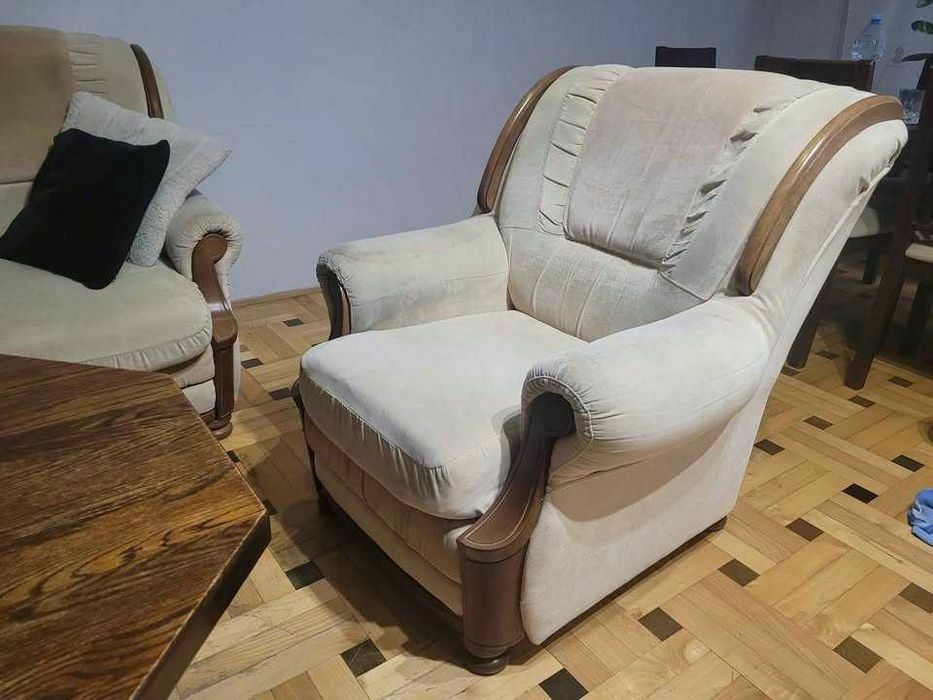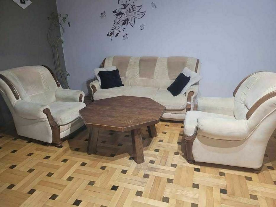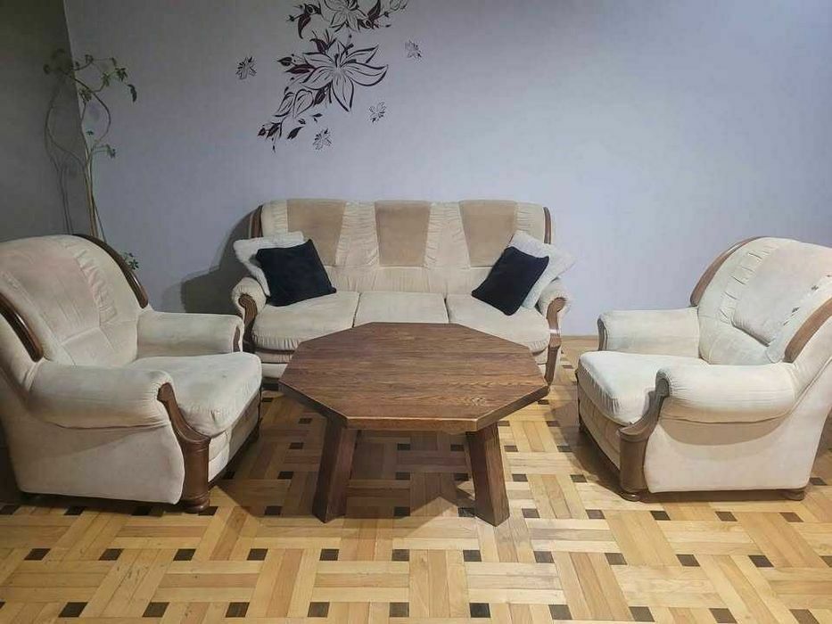 Wygodny, stylowy zestaw wypoczynkowy w jasnych kolorach. Składa się on z wygodnej sofy oraz dwóch foteli. Drewniany, ośmiokątny stolik pośrodku dopełnia całość. Całość prezentuje się elegancko i nadaje wnętrzu przytulny charakter.Dominika