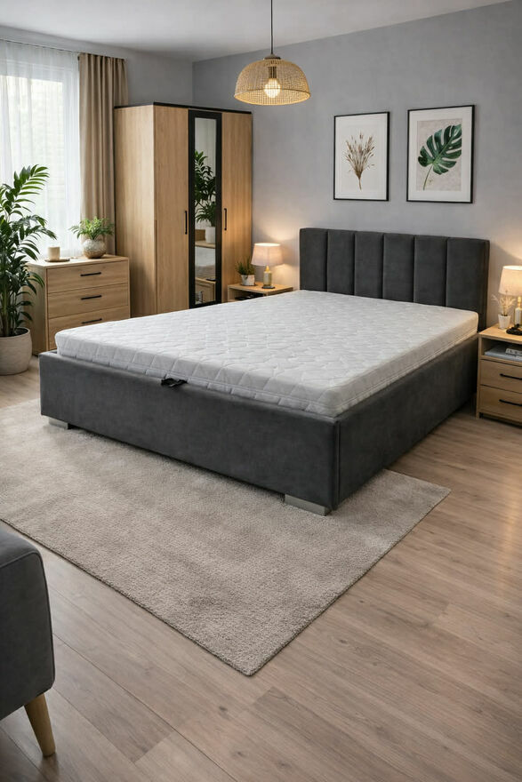 Ogłoszenie dotyczy łóżka o wymiarach 140x200 ze stelażem drewnianym bez pojemnika na pościel. Do wyboru 5 wzorów wezgłowia.