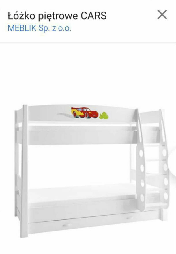 Łóżko piętrowe CARS firmy Meblik z materacami w idealnym stanie. Używane bardzo krótko łóżko jest już złożone dlatego wstawiam zdjęcie poglądowe ze sklepu solidna konstrukcja bez żadnych uszkodzeń ani zarysowań motyw CARS idealny dla dziecka prezentuje się bardzo ładnie i nowocześnie. W zestawie komplet mebli widoczny na zdjęciach duża szafa narożna regał z półkami i szufladami biurko z półką wiszącą kolor biały z ciemnym drewnem całość w świetnym stanie bez śladów użytkowania łóżko piętrowe CARS z materacami 1000 zł komplet mebli 1000 zł stan idealny odbiór osobisty w Rzeszowie. Zapraszam do kontaktu możliwość obejrzenia na miejscuSprawdź zainteresowanie tym ogłoszeniem
