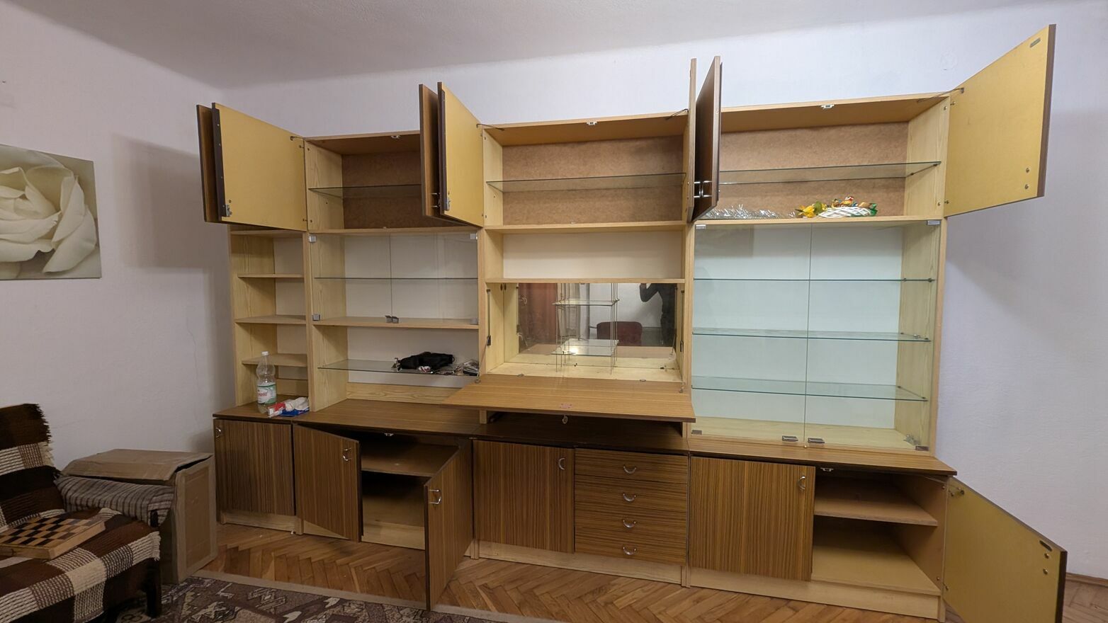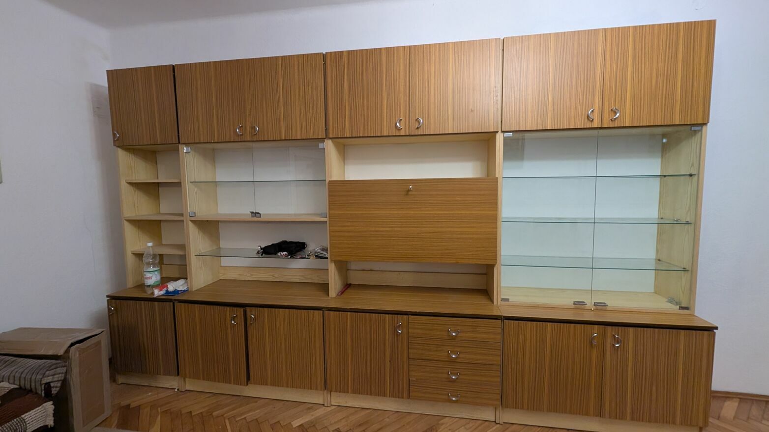 Solidna i funkcjonalna ścianka meblowa w kolorze drewna. Składa się z szafek, półek i szklanych gablot, które pozwalają na eksponowanie przedmiotów. Meblościanka jest w dobrym stanie.Meblościanka skład się z 4 pionów: