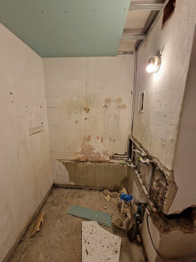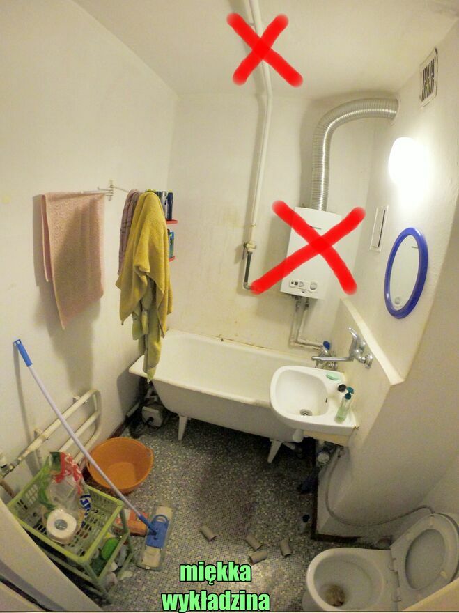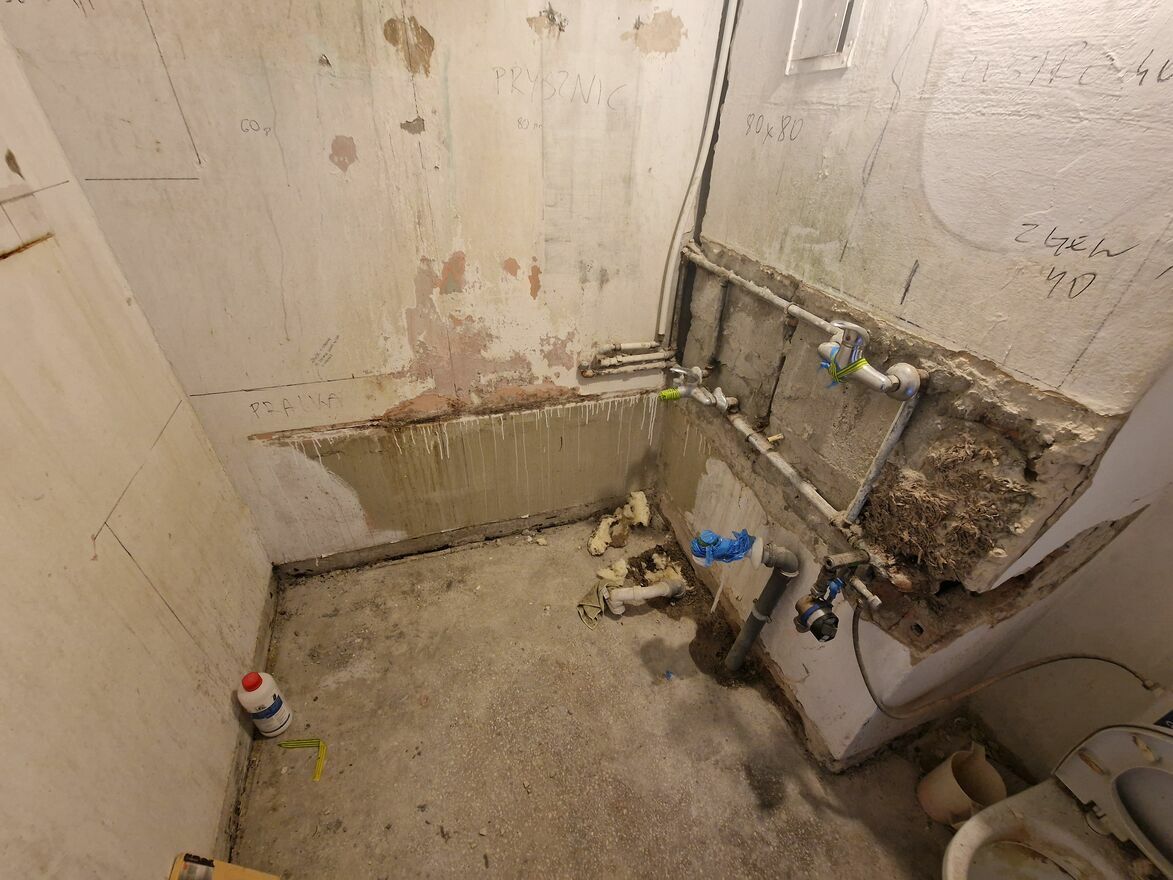 - brak łazienki (zaczęty sufit podwieszany, przespawany kaloryfer)