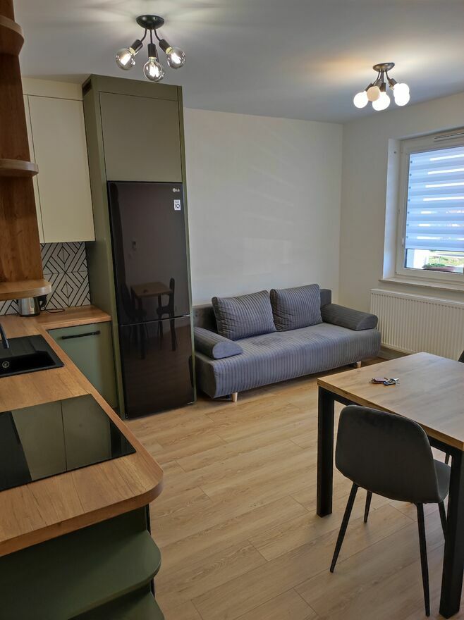 Mieszkanie jest w pełni umeblowane i wyposażone w niezbędne AGD (lodówka, pralka, kuchenka).