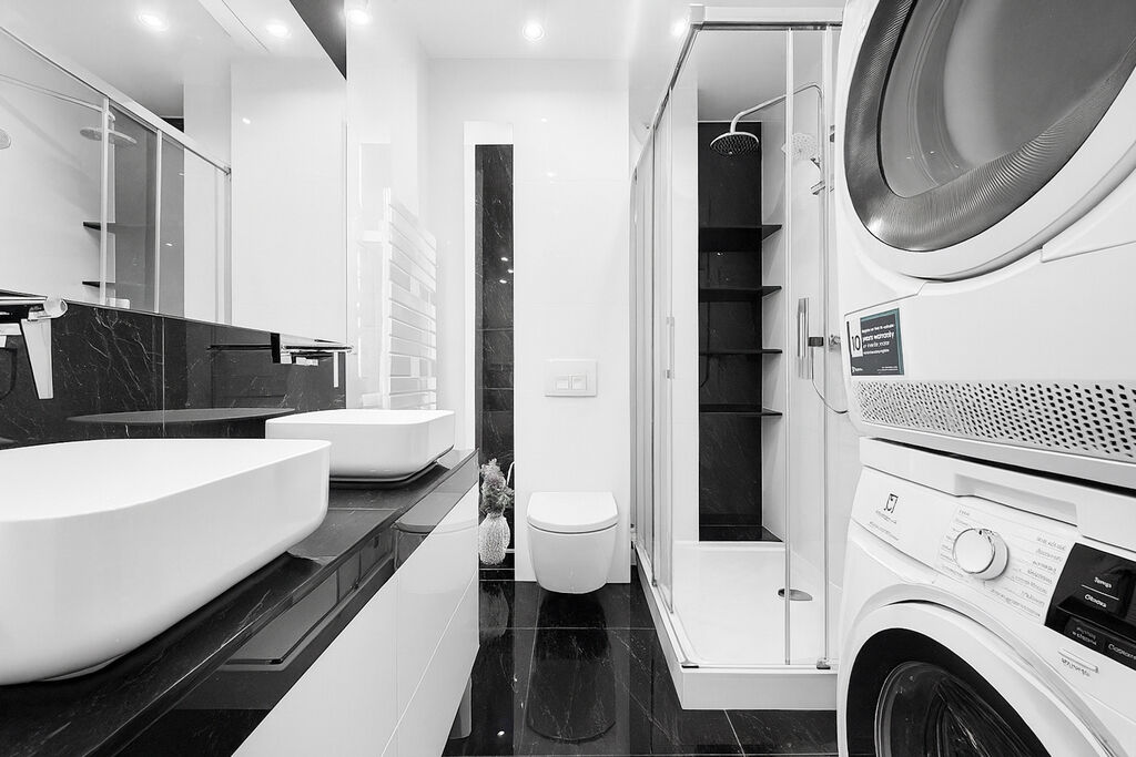-łazienka z prysznicem, pralką, suszarką i dwiema umywalkami