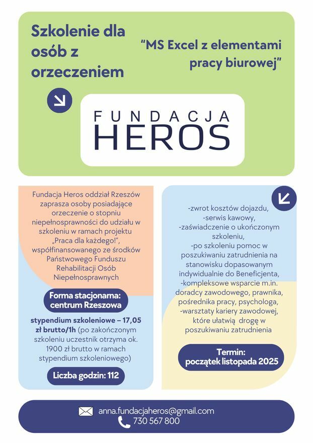 SZKOLENIE ZAWODOWE - MS Excel z elementami pracy biurowejFundacja Heros oddział Rzeszów zaprasza osoby posiadające orzeczenie o stopniu niepełnosprawności do udziału w szkoleniu pn. "MS Excel z elementami pracy biurowej" w ramach projektu „Praca dla każdego!”, współfinansowanego ze środków Państwowego Funduszu Rehabilitacji Osób Niepełnosprawnych.