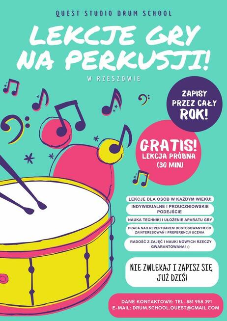 Lekcje gry na perkusji – Rzeszów Zapraszam na indywidualne lekcje gry na perkusji w Quest Studio Drum School w ...