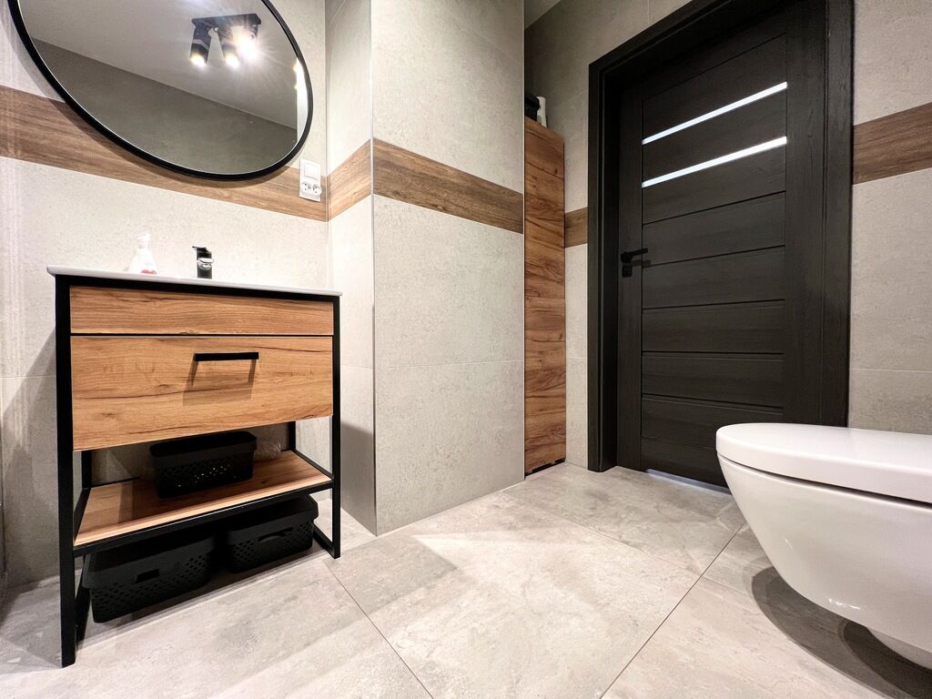 - na podłodze płytki oraz panele winylowe