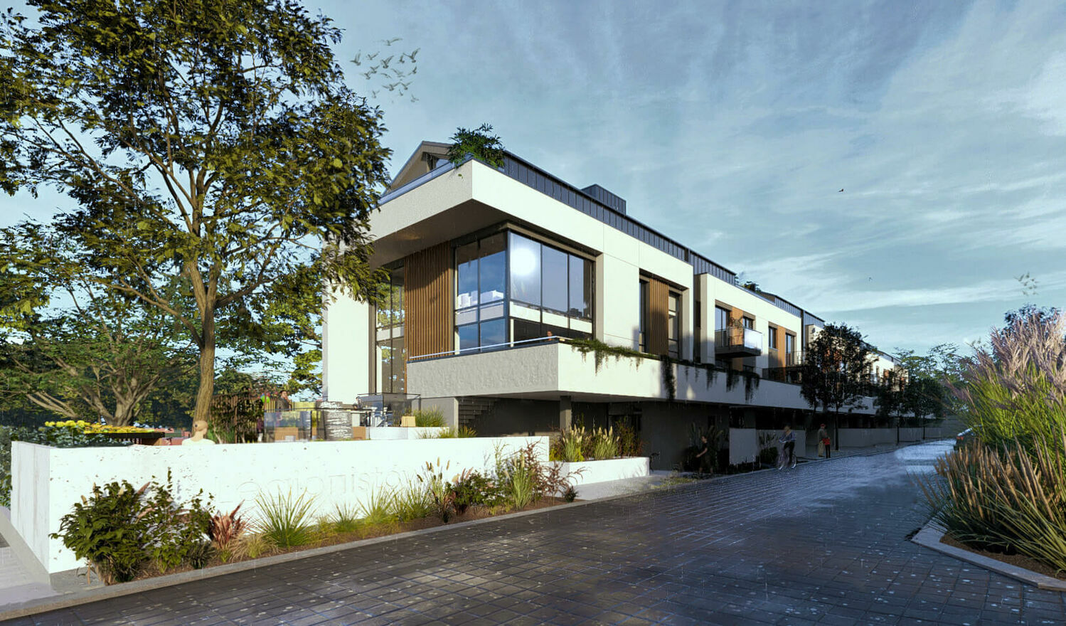 starannie zaprojektowana zieleń osiedlowa: drzewa, pnącza i bluszcze
