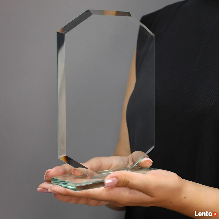 Gotowa statuetka będzie wyglądać jak na głównym zdjęciu w galerii. Na szkle naniesiemy Twój tekst, przy zachowaniu stałych elementów graficznych. Zdjęcia w galerii prezentują także czyste szkło przed nadrukiem, aby ukazać wykończenie krawędzi.