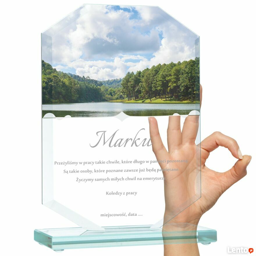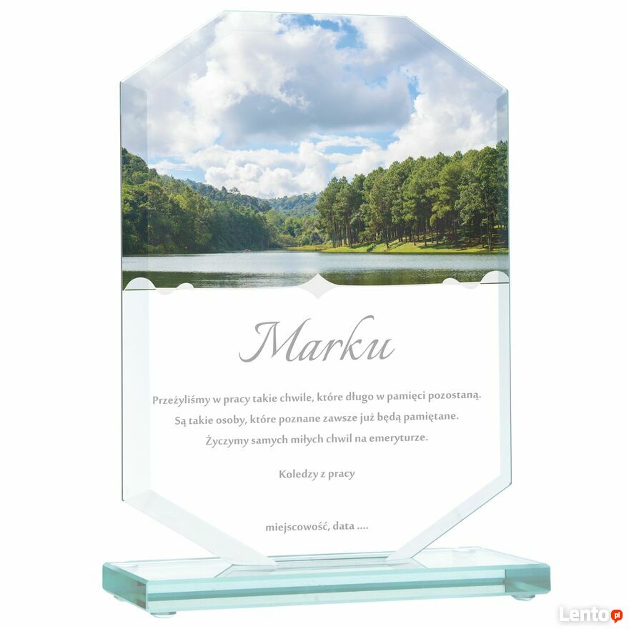 Na powierzchni szkła umieszczamy kolorowy nadruk z dowolnie wybranym przez Ciebie tekstem. To właśnie personalizacja sprawia, że statuetka staje się niepowtarzalną pamiątką. Możesz zamieścić m.in.: