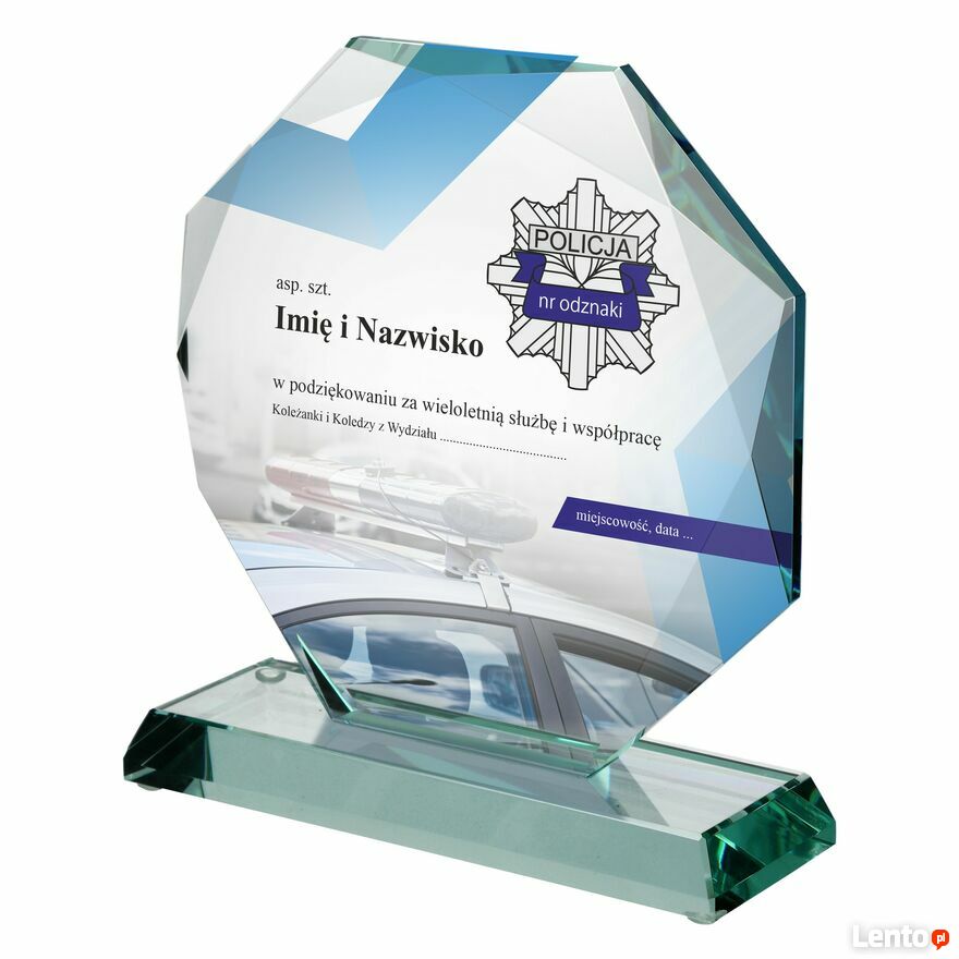 Szklana statuetka z gwiazdą policyjną i motywem radiowozu to elegancka pamiątka, która w wyjątkowy sposób podkreśla służbę i zasługi w Policji. Doskonale sprawdzi się jako prezent na emeryturę, jubileusz, awans czy podziękowanie za lata pełnienia obowiązków i współpracy w ramach służby.