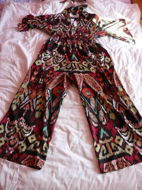 Do sprzedania uzywane,kolorowe sukienko-spodenki wiazane na szyi,Shein.Rozmiar 1XL.szerokosc w talii 40-41 cm,pod pachami ok.60 cm,dlugosc ok.136 cm,dlugosc nogawki ok.60 cmcvv