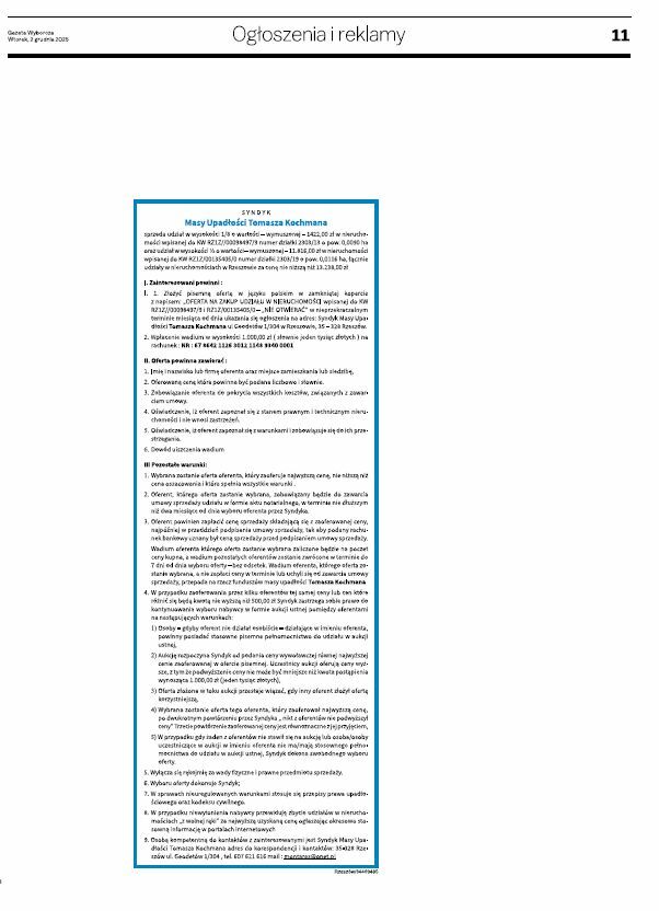 SYNDYK Masy Upadłości Tomasza Kochmana sprzeda udział w wysokości 1/8 o wartości – wymuszonej – 1422,00 zł w nieruchomości wpisanej do KW RZ1Z//00098497/9 numer działki 2303/13 o pow. 0,0090 ha oraz udział w wysokości 1⁄2 o wartości – wymuszonej – 11.816,00 zł w nieruchomości wpisanej do KW RZ1Z/00135405/0 numer działki 2303/19 o pow. 0,0116 ha, łącznie udziały w nieruchomościach w Rzeszowie za cenę nie niższą niż 13.238,00 złI. Zainteresowani powinni :