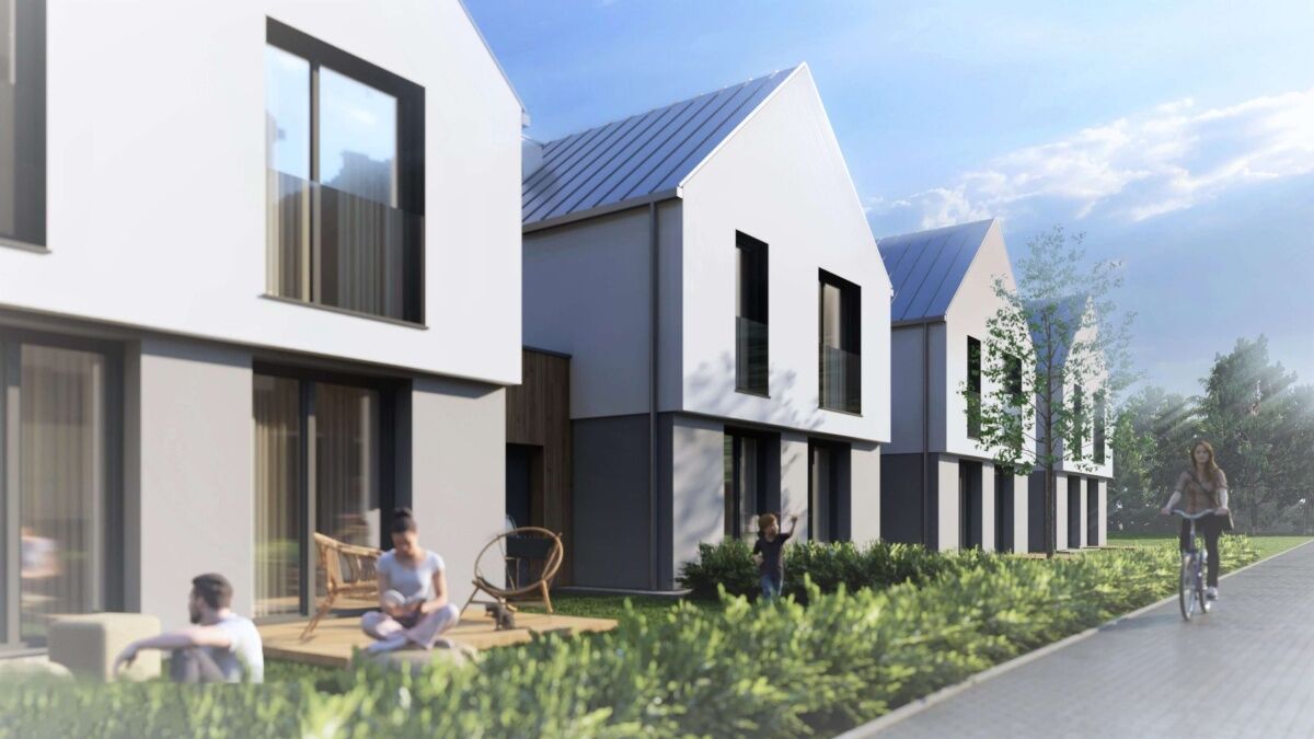 Biała elewacja z szarymi akcentami i deski elewacyjne kompozytowe oraz stolarka okienna i drzwiowa w kolorze grafitowym, nadają budynkom elegancki wygląd