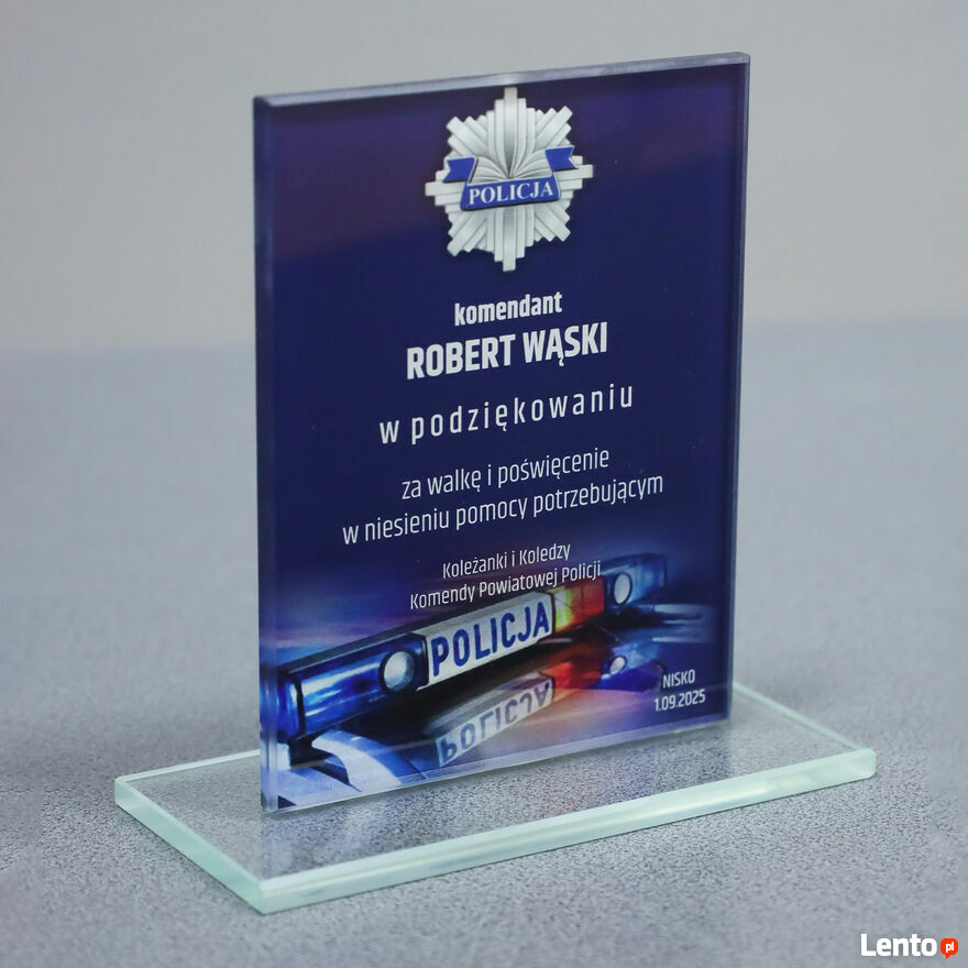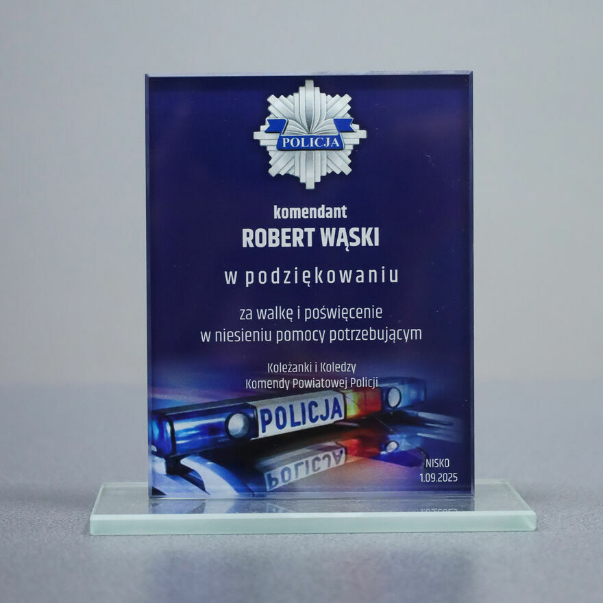 MODEL WZORU M65D_1Szklane trofeum dedykowane funkcjonariuszom Policji to wyjątkowy sposób na uhonorowanie służby i odwagi. Idealnie sprawdzi się jako podziękowanie z okazji jubileuszu, przejścia na emeryturę, awansu, zakończenia służby czy innych ważnych uroczystości. To elegancki prezent, który w trwały sposób upamiętnia zasługi oraz poświęcenie dla bezpieczeństwa obywateli.