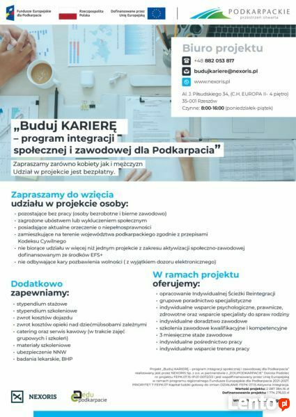 Projekt „BUDUJ KARIERĘ – program integracji społecznej i zawodowej dla Podkarpacia” realizowany jest przez NEXORIS Sp. z o. o. w partnerstwie z „EDUPODKARPACIE” Dorota Podolec nr projektu FEPK.07.15-IP.01-0072/23 i jest współfinansowany przez Unię Europejską w ramach programu regionalnego Fundusze Europejskie dla Podkarpacia 2021-2027, PRIORYTET 7 FEPK 07 Kapitał ludzki gotowy do zmian DZIAŁANIE FEPK 07.15 Aktywna integracja.GRUPA DOCELOWA PROJEKTU: Uczestnikami Projektu będzie 80 osób (w tym 44 Kobiety i 36 Mężczyzn) zagrożonych ubóstwem lub wykluczeniem społecznym, którzy zamieszkują na terenie województwa podkarpackiego zgodnie z przepisami Kodeksu Cywilnego.