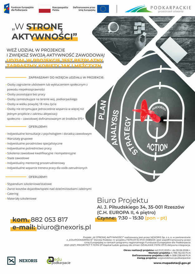 Projekt „W STRONĘ AKTYWNOŚCI” realizowany jest przez NEXORIS Sp. z o. o. w partnerstwie z „EDUPODKARPACIE” Dorota Podolec nr projektu FEPK.07.15-IP.01-0083/23 i jest współfinansowany przez Unię Europejską w ramach programu regionalnego Fundusze Europejskie dla Podkarpacia 2021-2027, PRIORYTET 7 FEPK 07 Kapitał ludzki gotowy do zmian DZIAŁANIE FEPK 07.15 Aktywna integracja.GRUPA DOCELOWA: