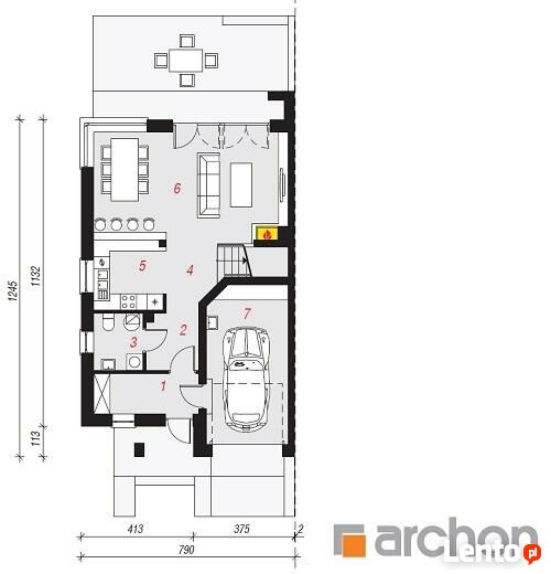 Charakteryzuje się funkcjonalną przestrzenią wewnętrzną, która łączy kuchnię, jadalnię oraz dobrze doświetlony kącik telewizyjny w jednoprzestrzenną całość. Duże przeszklenia, szerokie wyjście na taras pozwalają na kontakt z zielenią.